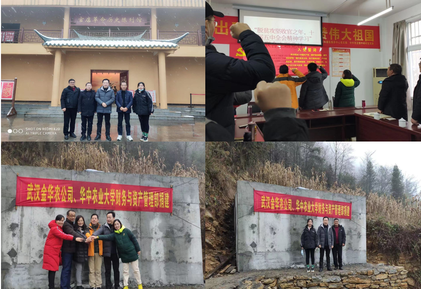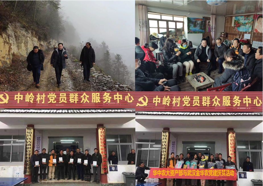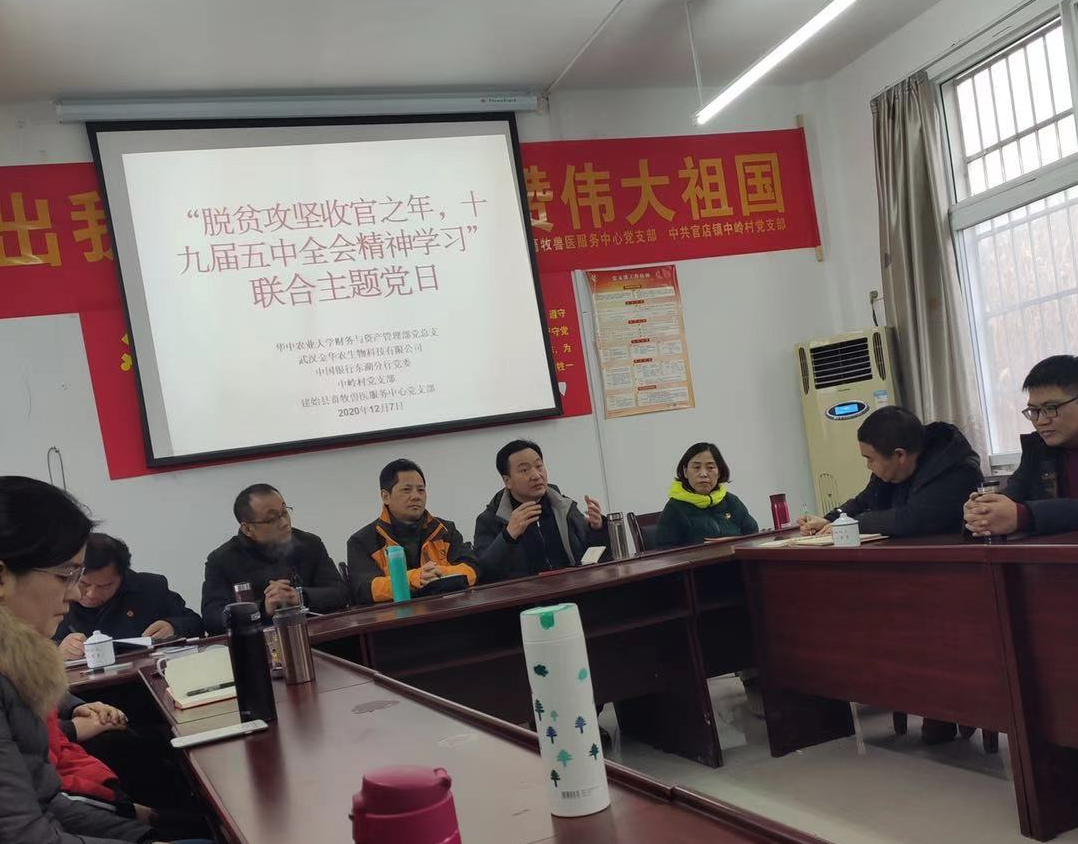 12月6日~8日,華中農業大學財資部黨總支書記李仁剛、副部長李剛、武漢金華農生物公司董事長富勝、中國銀行華農支行行長余陽、校資財部支部委員代表和公司扶貧組成員一行,再次前往華中農業大學扶貧點建始縣,赴官店鎮中嶺村開展“脫貧攻堅收官之年”暨“十九屆五中全會精神學習”聯合主題黨日活動,并共同見證“校企聯合”脫貧攻堅項目的成功建成。