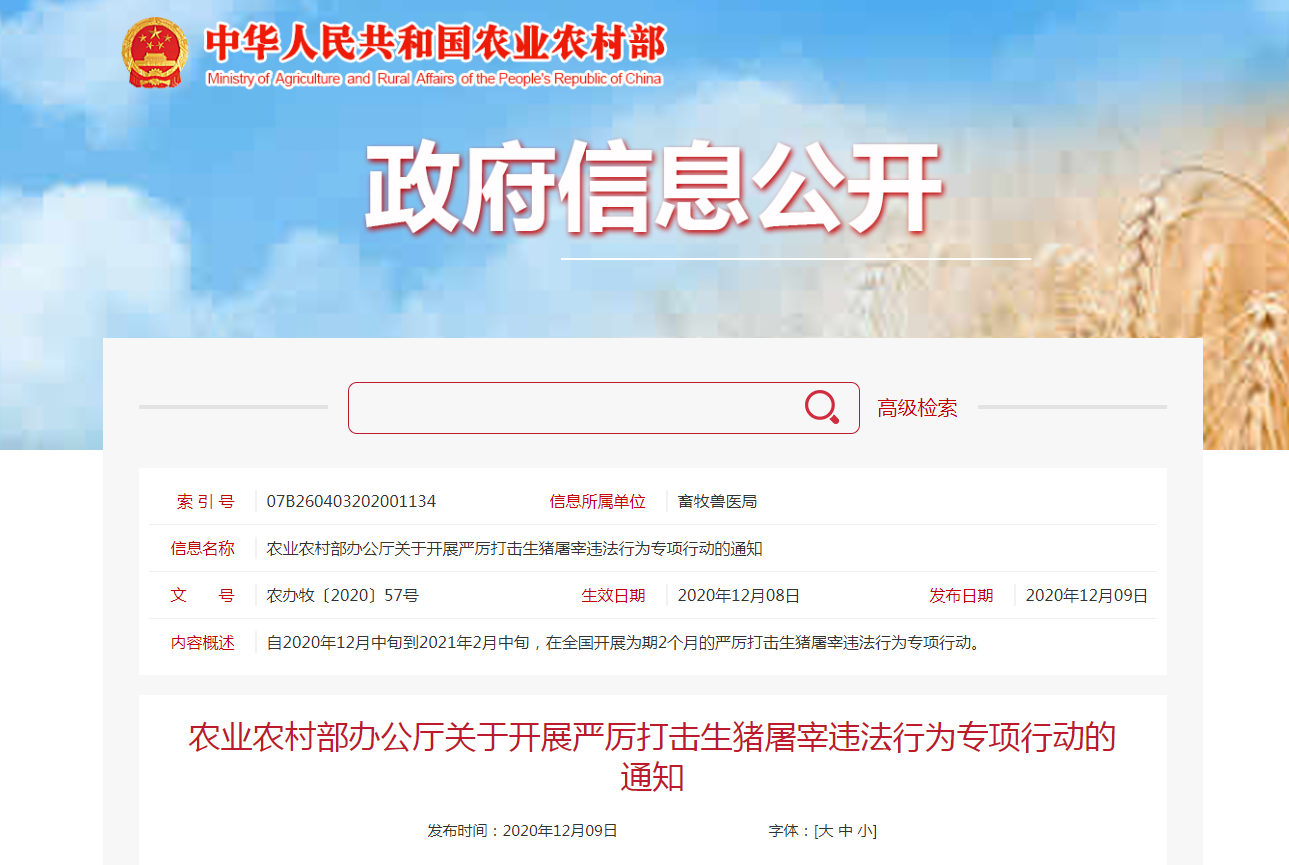 今年以來,各地通過開展農產品質量安全專項整治“利劍”行動,查辦了一批屠宰環節違法案件、搗毀了一批私屠濫宰窩點、銷毀了一批問題產品,有力支持了全國非洲豬瘟防控和生豬生產恢復,有效保障了生豬產品質量安全。隨著冬季,特別是元旦春節消費旺季的到來,豬肉產品消費將進入高峰期,從近期各地案件查辦情況看,私屠濫宰等屠宰環節違法案件呈上升趨勢。為切實維護生豬屠宰行業秩序,保證生豬產品質量安全,保障節日期間豬肉消費安全和人民身體健康,農業農村部決定自2020年12月中旬到2021年2月中旬,在全國開展為期2個月的嚴厲打擊生豬屠宰違法行為專項行動。現就有關事項通知如下。