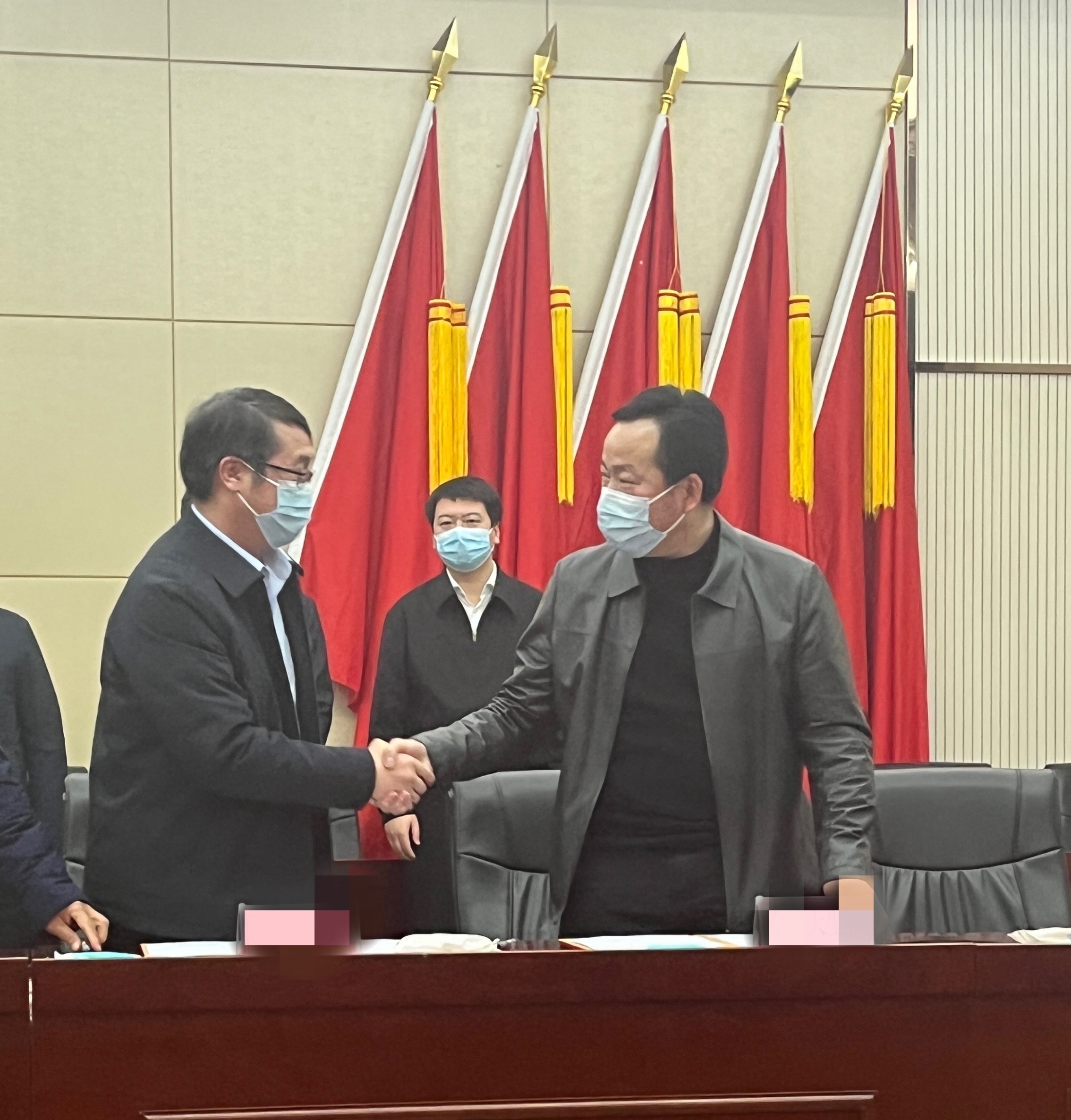 ▲公司董事長、總經理富勝與市領導親切友好握手