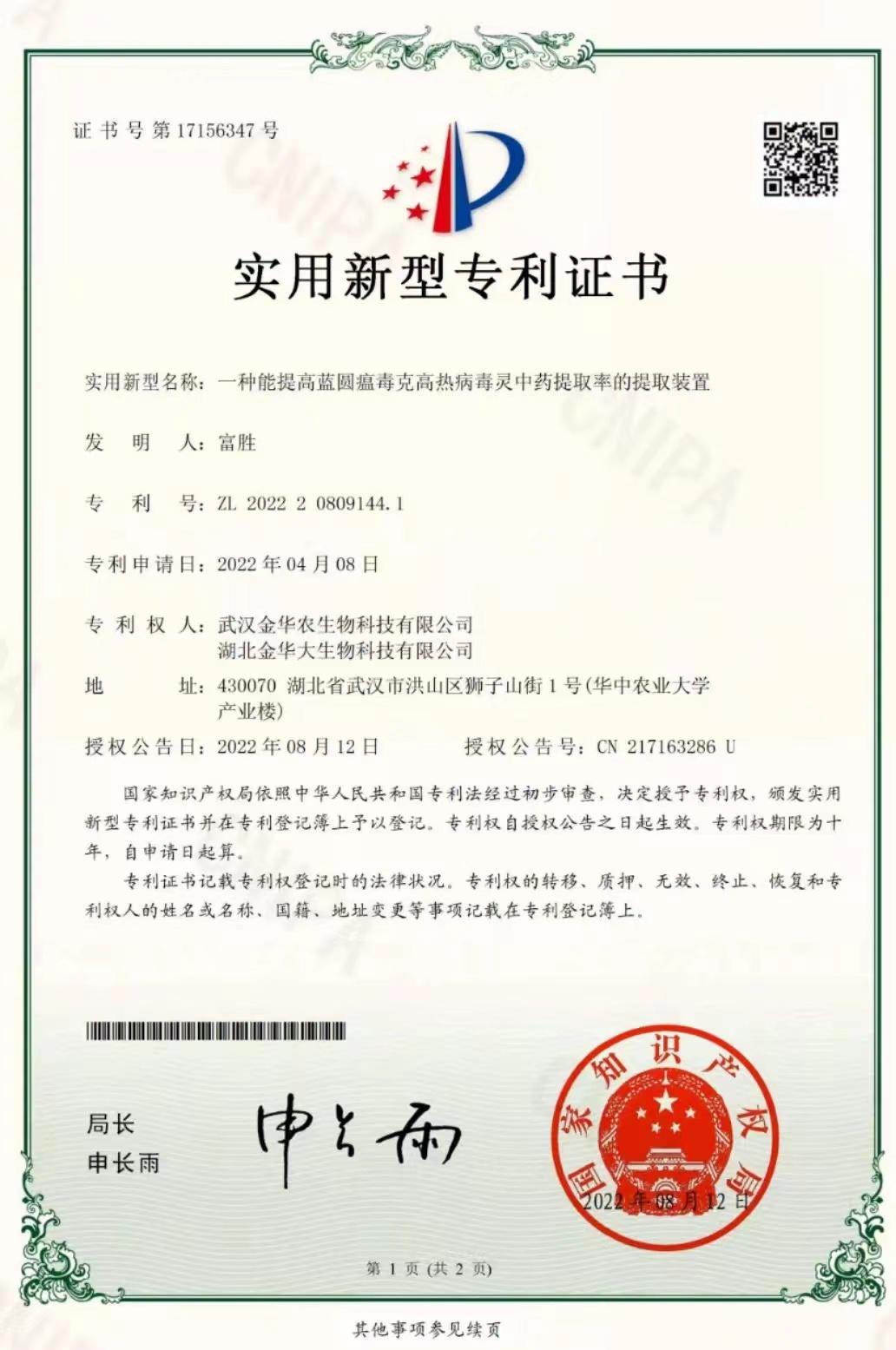 科技專(zhuān)利證書(shū)(藍(lán)圓瘟毒克):專(zhuān)利號(hào)—202220809144.1