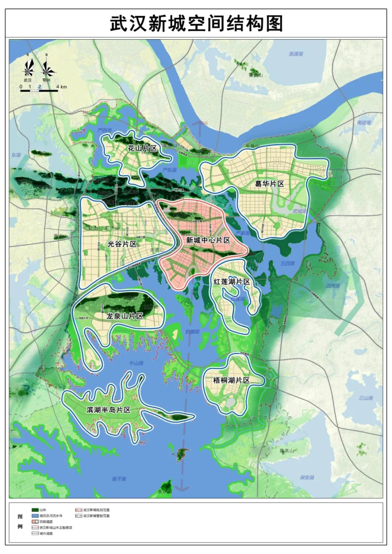 新城建設總體打造“兩高地、兩中心、一樣板”的新城空間結構。即世界級科技創新策源高地、國家戰略性新興產業高地;全國科創金融中心、國際交往中心;中國式現代化宜居濕地城市樣板。將光谷片區和葛華片區,作為高端制造業和科技創新的綜合性片區,建設高精尖產業承載地和技術創新策源地、新興產業集聚區和未來產業先導區。