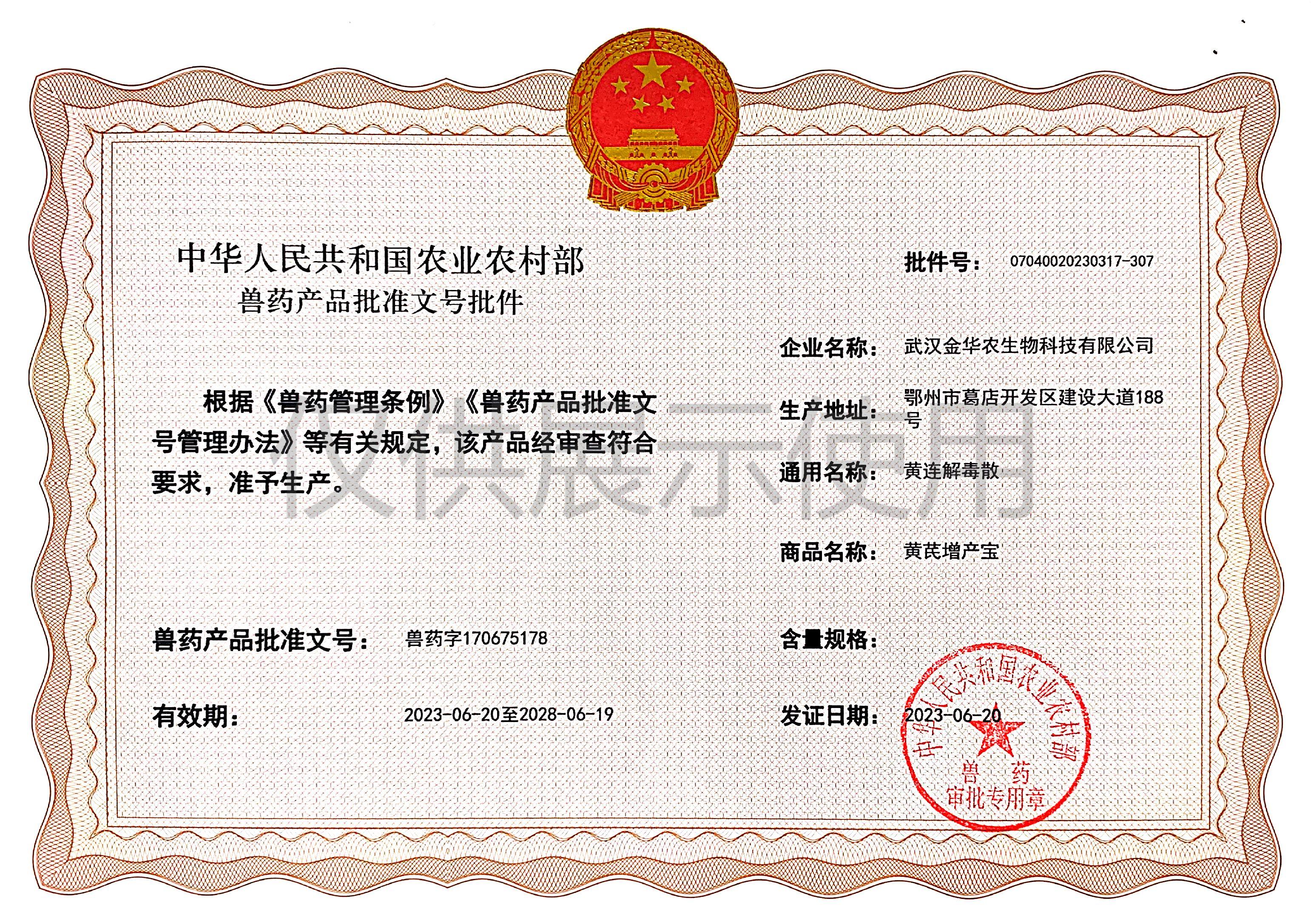 根據《獸藥管理條例》和《獸藥產品批準文號管理辦法》的規定,經農業農村部審查,準予核發武漢金華農生物科技有限公司(以下簡稱“武漢金華農生物”)國家新版GMP6種獸藥相關產品批準文號,這是繼今年5月我司獲得第一批新版GMP獸藥批準文號后再一次獲得獸藥產品批準文號。