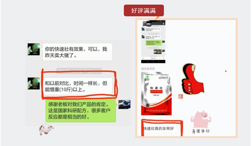 ? ? ?(2)阜陽本地區的養殖戶對公司專利產品“快速壯”十分認可,市場銷量非常好,經養殖戶反饋,使用“快速壯”不到一周的時間,豬群食欲大增,采食量增加。使用半個月,豬只后驅明顯豐滿,豬毛發亮。經對比,同時期出欄的豬群,用了“快速壯”的養殖戶一頭豬可以多賣300塊錢。張老師家的幾百頭牛也長期使用“快速壯”,能促進多余的營養成分轉化為脂肪,改善肉質、增強瘤胃動力,育肥牛能多增重20-25斤,提前出欄。母牛妊娠期間使用“快速壯+奶倍加”黃金組合,能快速提高母牛的產奶量,延長泌乳高峰期,同時可以促進小牛的生長發育。