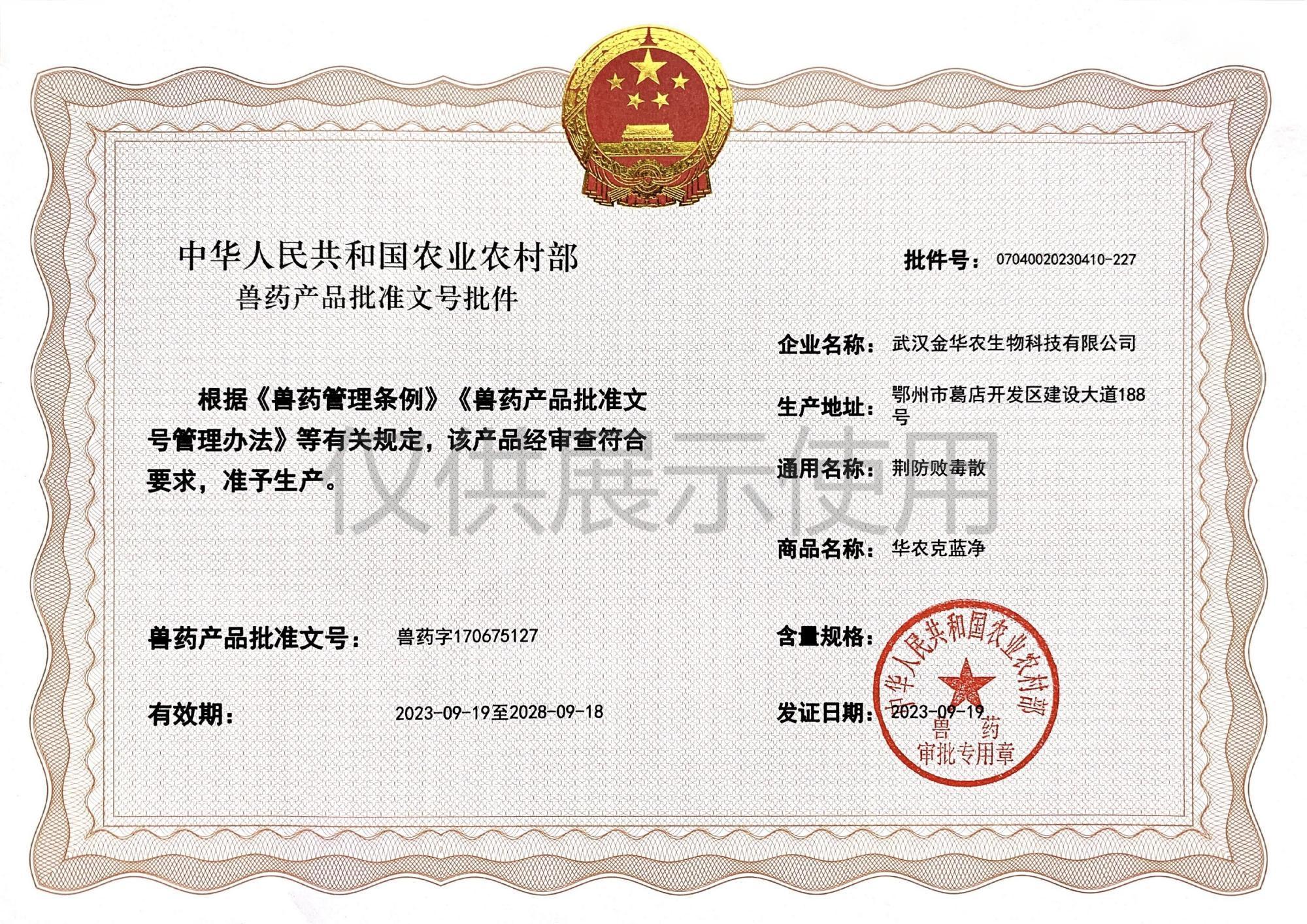 近日,我司申報的新獸藥“華農感康靈”(荊防敗毒散)、“華農利可欣”(20%硫酸新霉素可溶性粉)正式獲批,并獲得國農業農村部頒發的新獸藥產品批準文號批件。