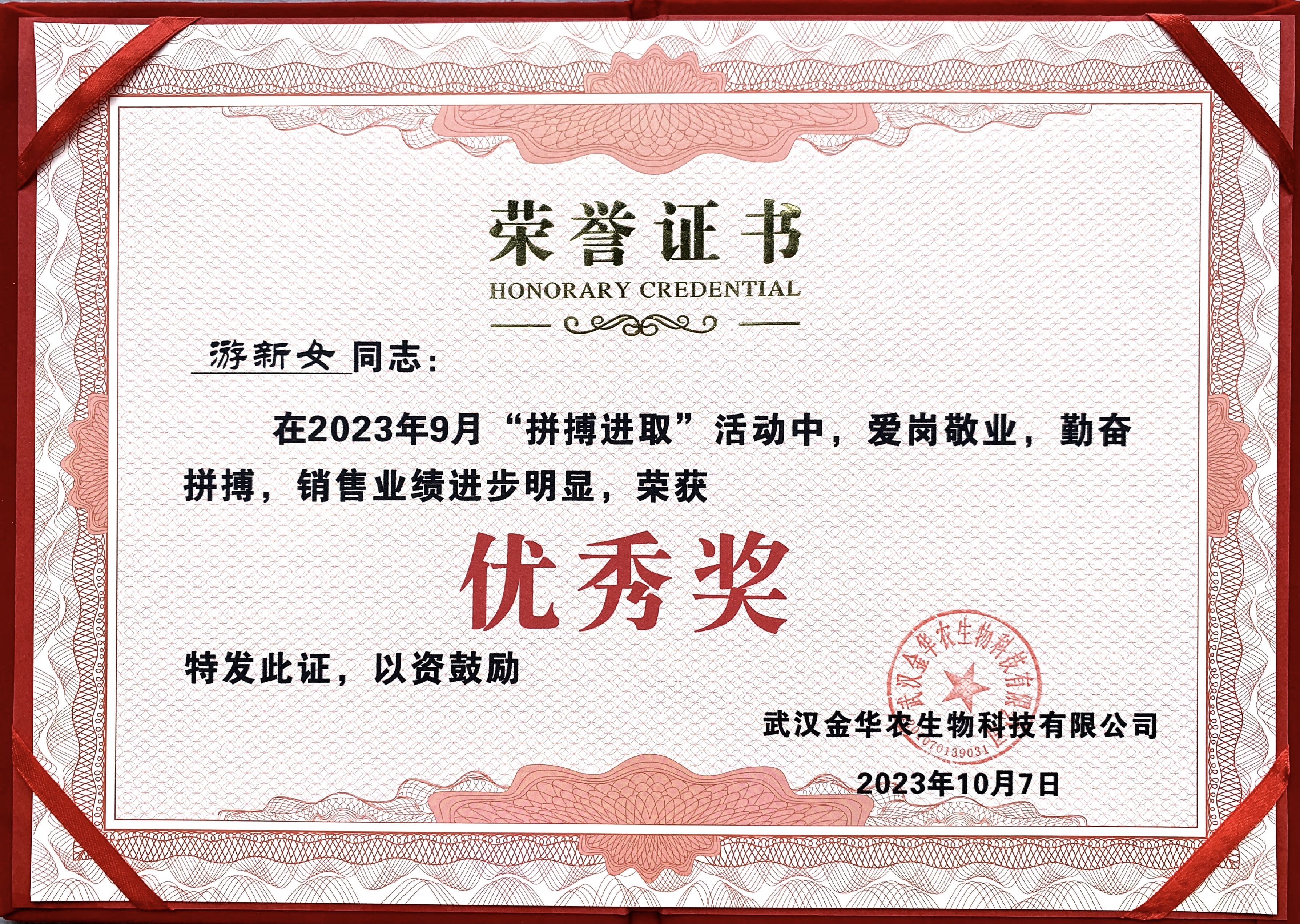 祝賀廣州市場孟小平經理在2023年“拼搏進取”活動中榮獲優秀獎。作為奮斗在市場一線的他,每天要面對形形色色的客戶,想客戶所想,急客戶所急,為客戶排憂解難,獲得了越來越多客戶的認可。一切為了銷售、業績就是最強有力的話語,他自身的價值也在銷售中得到淋漓盡致的體現。他必將帶動武漢金華農更加美好的明天。