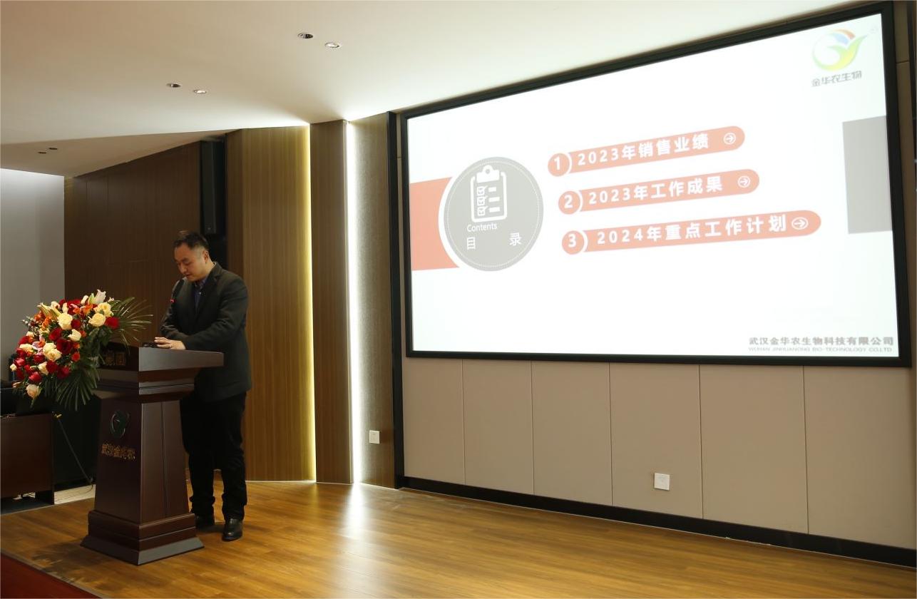 ? ? ? ?辭舊迎新、筑夢前行,2024年1月9日~12日,武漢金華農(nóng)生物科技有限公司2023年度工作總結(jié)暨優(yōu)秀表彰大會在公司行政大樓報告廳隆重舉行。來自華中農(nóng)業(yè)大學(xué)的院系領(lǐng)導(dǎo)和專家教授、省獸藥監(jiān)察所行業(yè)主管負責(zé)人、公司領(lǐng)導(dǎo)及部門主管、近30個省市的市場精英代表逾百人齊聚盛會。