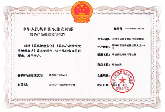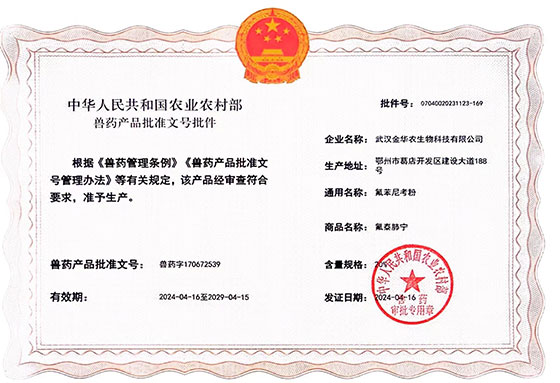 根據《獸藥管理條例》和《獸藥產品批準文號管理辦法》的規定,經農業農村部審查,準予核發武漢金華農生物科技有限公司2個新版GMP獸藥相關產品批準文號。