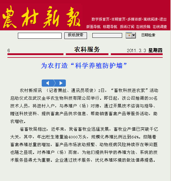 ??? 3月2日,我公司與湖北日報農村部聯合開展“畜牧科技進農家”活動,此活動揭牌儀式在武漢金華農生物科技有限公司會議大廳成功舉行。