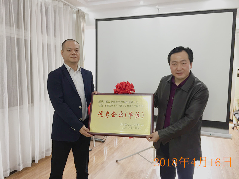 2018年4月16日,武漢金華農生物應邀出席并參加武漢市“企業家論壇”活動暨武漢市“優秀企業”評選與表彰大會,我公司光榮獲得“優秀企業”稱號!本次會議是由武漢市政府質量安全監督局、統籌規劃局、農業局、畜牧局共同組織、策劃與承辦。
