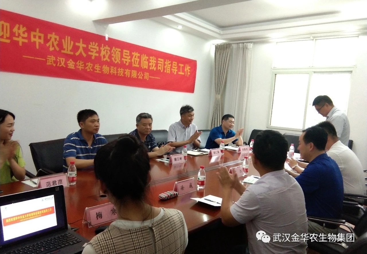 2019年6月12日,華中農(nóng)業(yè)大學(xué)黨委副書記、副校長姚江林,華中農(nóng)業(yè)大學(xué)資產(chǎn)經(jīng)營與后勤保障部部長李寒,華中農(nóng)業(yè)大學(xué)校友與基金工作辦公室主任楊仁海,華中農(nóng)業(yè)大學(xué)資產(chǎn)經(jīng)營與后勤保障部副部長劉春全,一行4人蒞臨武漢金華農(nóng)生物科技有限公司,就雙方深入開展校企聯(lián)合等工作進(jìn)行會(huì)談交流。