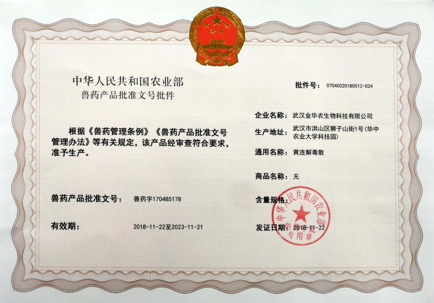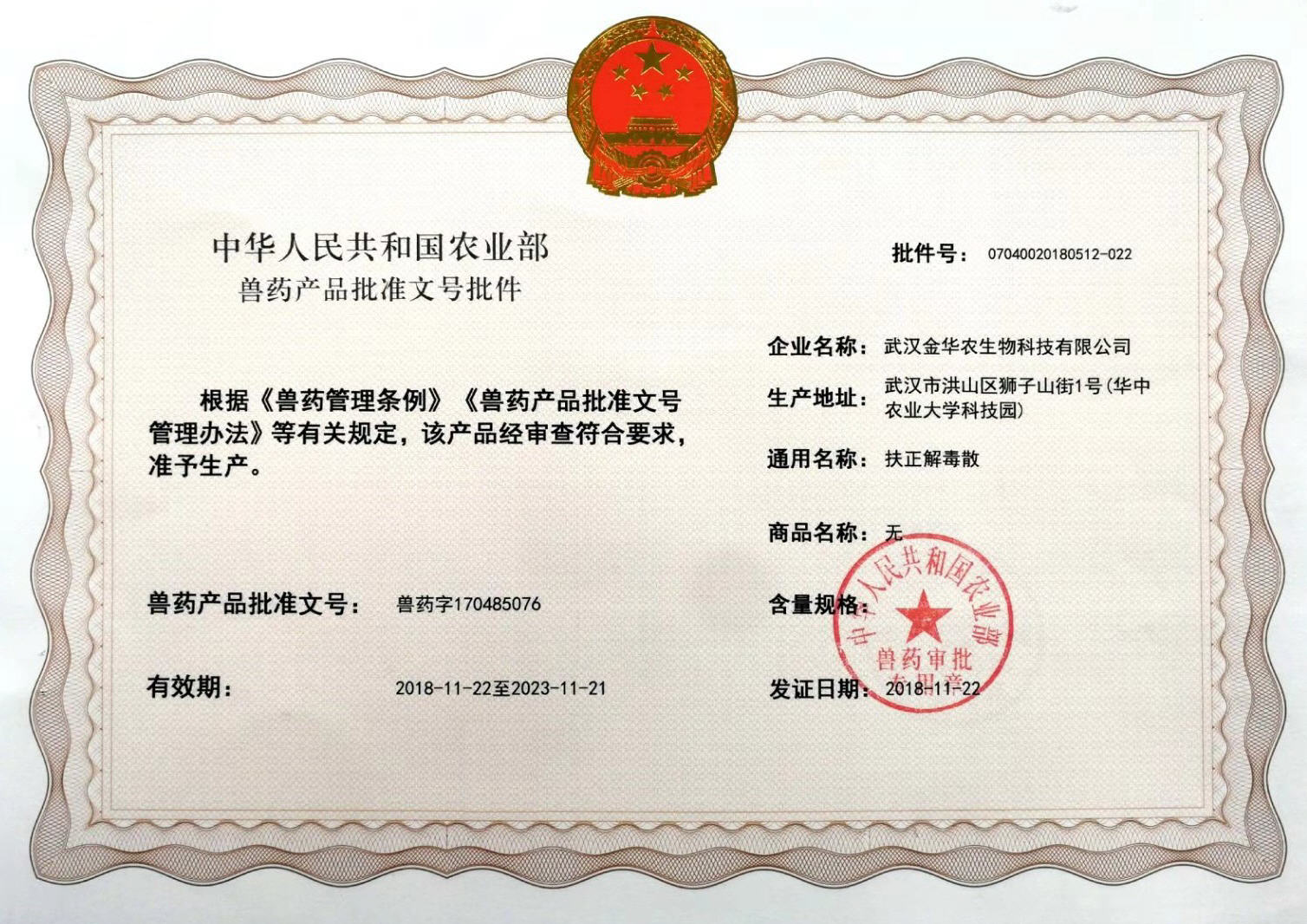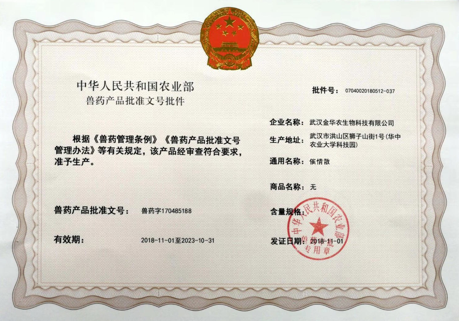 喜訊:2018年12月4日,武漢金華農生物首批“新獸藥”申報的批文批號,獲得國家農業農村部認可,正式頒發批文批件和榮譽證書!感謝社會各界同仁與養殖朋友們對我司的長期信任、支持與贊美!感謝行業各級主管單位對我司的大力支持與肯定!感謝全體武漢金華農人的辛勤付出與努力拼搏!公司為你們感到無比驕傲,和自豪!武漢金華農的明天必定更加精彩和輝煌!